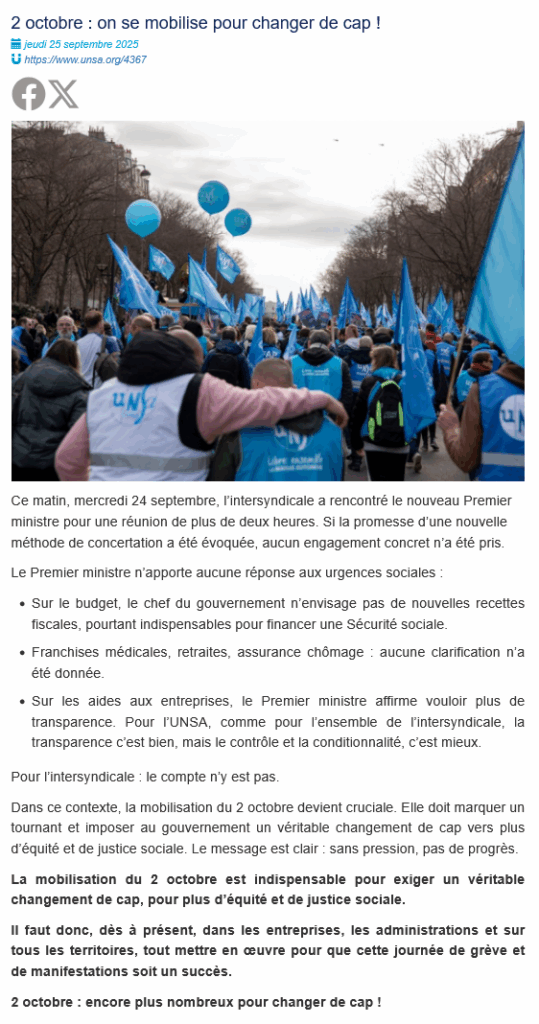 Le mercredi 24 septembre, l’intersyndicale a rencontré le nouveau Premier ministre pour une réunion de plus de deux heures. Le Premier ministre n’a apporté aucune réponse aux urgences sociales. L’intersyndicale réagit en proposant une nouvelle mobilisation le 2 Octobre ..
