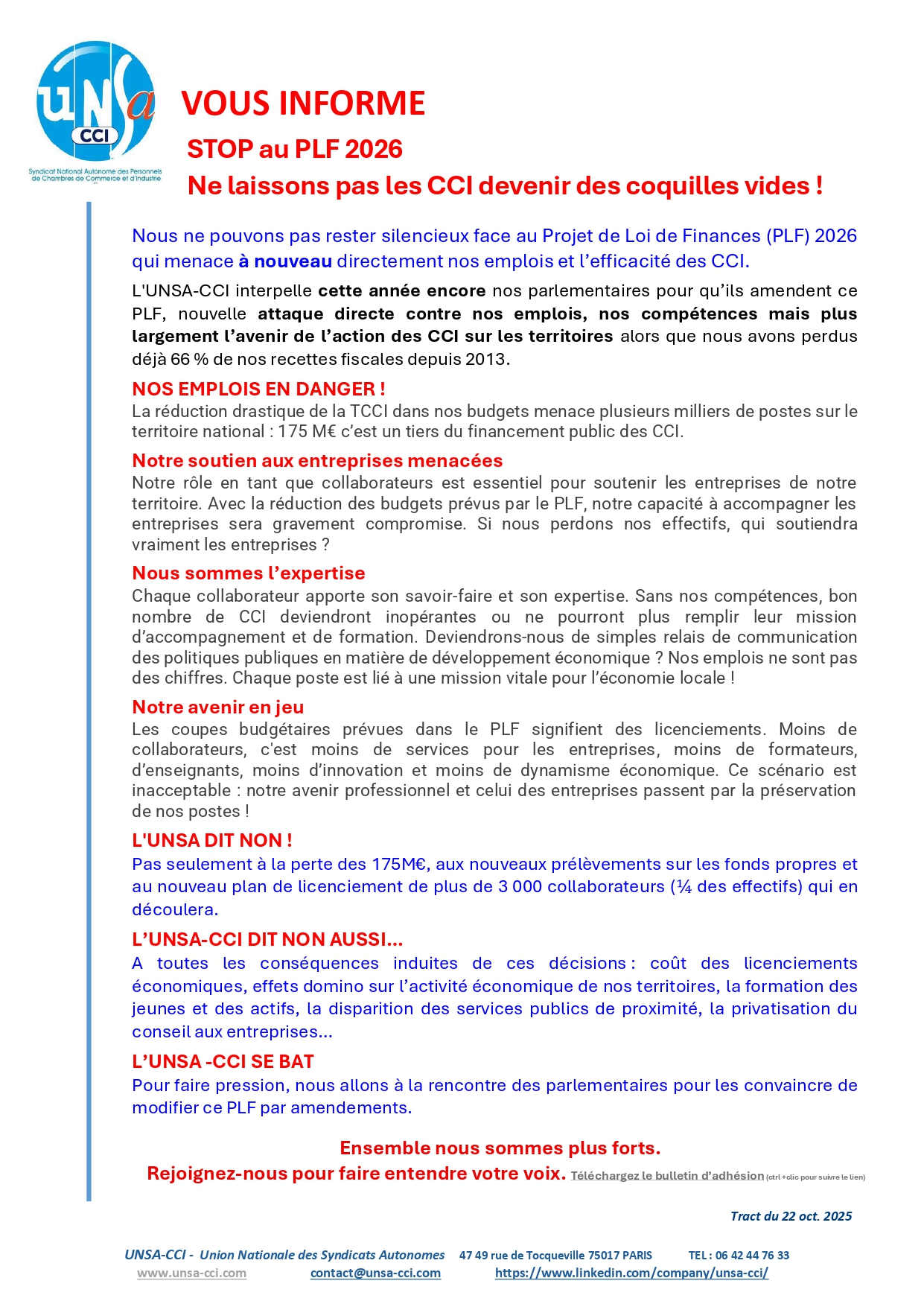 Nous ne pouvons pas rester silencieux face au Projet de Loi de Finances (PLF) 2026 qui menace à nouveau directement nos emplois et l’efficacité des CCI.